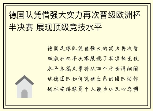 德国足球队凭借强大的实力,再次晋级欧洲杯半决赛,展现了其顶级竞技水平。本篇文章将从四个方面详细阐述德国队如何凭借出色的团队协作、战术安排、球员个人能力以及心态调整,成功闯入半决赛。首先,德国队展现了极...