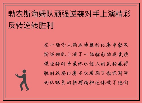在一场令人热血沸腾的比赛中,勃农斯海姆队上演了一场精彩的逆袭,顽强逆转对手,最终以惊人的反转赢得胜利。这场比赛不仅展现了勃农斯海姆队球员的拼搏精神,还体现了他们在困境中不放弃、不气馁的决心。文章将从四...